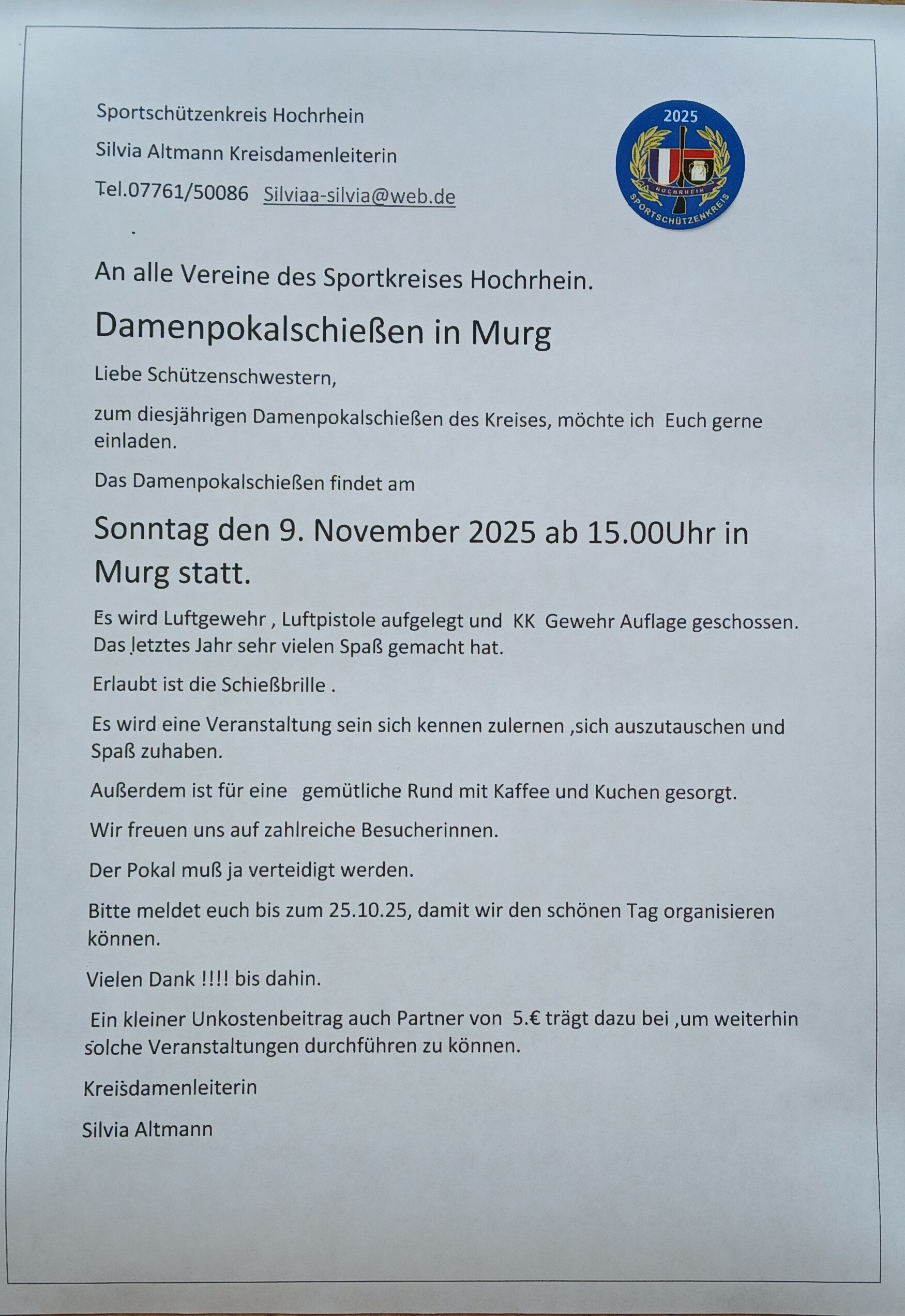 Liebe Schützenkameradinnen, zum traditionell jährigen Damenpokalschiessen am Sonntag, den 09.11.2025 ab 15:00 Uhr in Murg möchte ich Euch alle recht herzlich einladen. Wir wollen uns in den Disziplinen Luftgewehr, Luftpistole Auflage und KK-Gewehr Auflage vergleichen. Es soll aber in erster Linie das Kennenlernen, der Austausch und vor allem Spass im Vordergrund stehen. Für Kaffee und Kuchen ist gesorgt Nähere Informationen findet Ihr hier in der Ausschreibung. Bei Fragen könnt Ihr mir eine Email schicken, indem Ihr einfach auf mein Bild vorne klickt. Ich hoffe auf zahlreiche Beteiligung unserer Schützinnen aus dem Kreis. Schöne Grüße, Silvia (09.10.2025)
